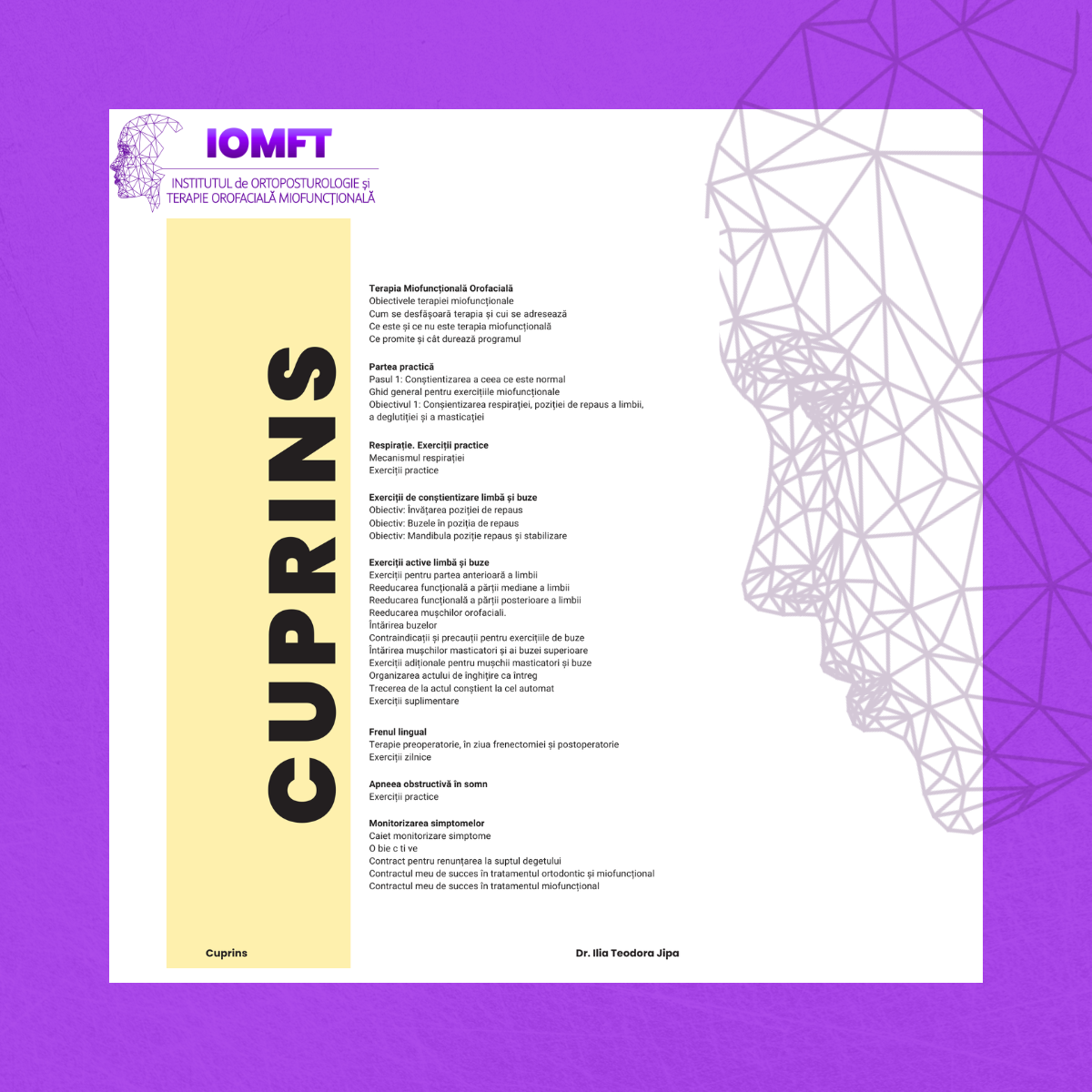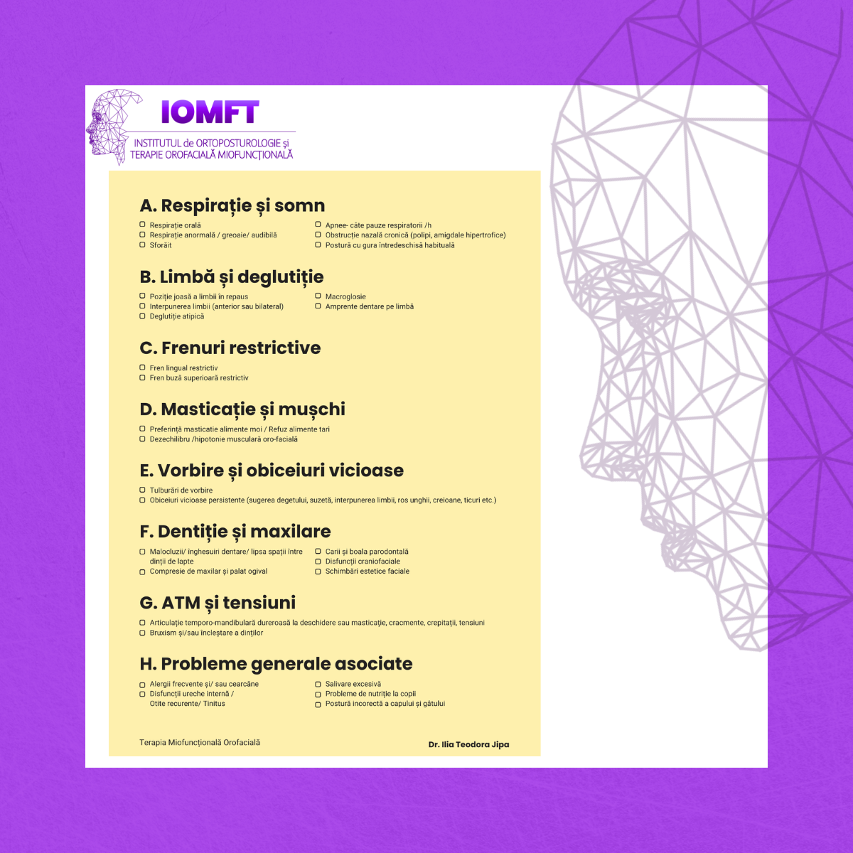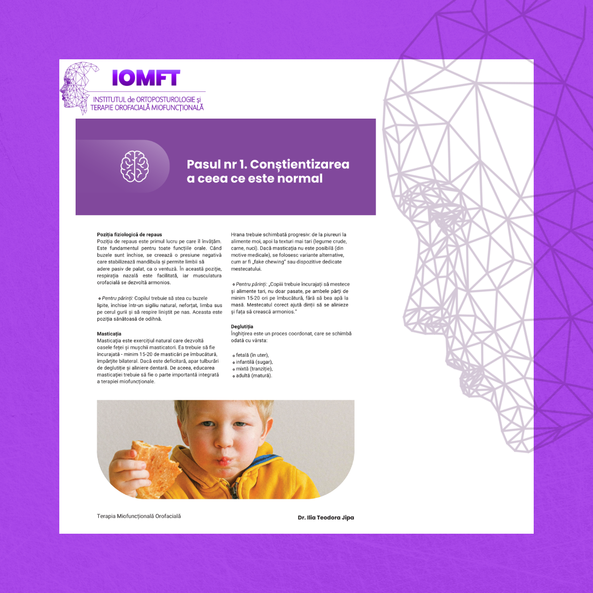 Este un instrument de lucru, construit pe principiile terapiei miofuncționale moderne, care abordează funcția ca fundament: respirația, poziția limbii, masticația, deglutiția și postura.